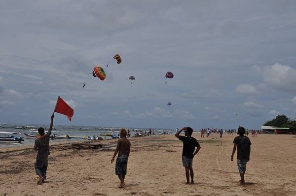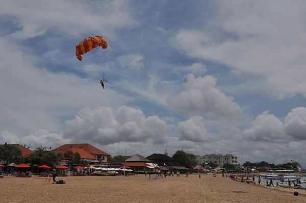 大概过了一个小时,就回到南湾海滩,还有一个小时的活动时间。大家决定再出去转下,看有没有便宜的活动。结果还真碰上了,有人出价$10,玩拖拽伞。有10 几个人跑去玩了。按地陪的说法,第一家要$20是含保险的。还真是的。没有保险的结果就是:第一,当你上到空中,看着地下美丽、纤巧的巴里岛,正High 的时候,突然,伞不往前跑了,就这么直直地掉了下来,落到海里;还好,马上有救生艇过去把你捞起来,你满身海草,再没了上天的念头,只想哭;第二,你看着 别人在天上飞了一大圈,眼巴巴看着他下来,兴致冲冲地跑过去,套上降落伞的绳子,听到指挥说ok,拔腿就跑;刚要起来,突然又被喊停;只好退回来,等了一 会;这时,指挥上来叽里呱啦说了一番。玩不了了,12点30左右,退潮了,摩托艇跑不起来。够扫兴的吧?这都被我们碰到了。好歹,我们还是抓住1小时的时 间,让10个团员上了天。我也上去了,在天上自由翱翔的感觉真好。