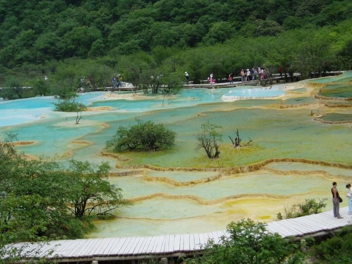 坐黄龙的缆车(80元)至山顶,会使游玩轻松很多(前二次均是爬上山的,因高原原因,人很累)。下了缆车,走两公里左右的空中平行栈道,再爬几百米就到了黄龙顶端——五彩池(从坐缆车到五彩池约1个小时)。