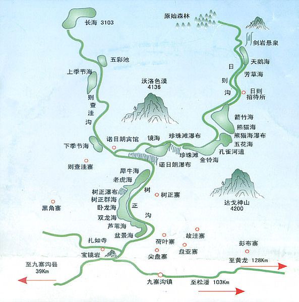 先简单介绍一下九寨沟地形。九寨沟呈“Y”字,沟口在主干最下面,因里面有九个藏族村寨得名,已经有三个村寨开发出来,都比较富裕。主干叫树正沟,左丫叫则查洼沟,右丫叫日则沟。要早起,赶上最早一班进沟的旅游车。早餐一定要吃饱,因为上午游览是重点,可能午饭会很晚才能吃到。