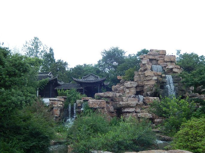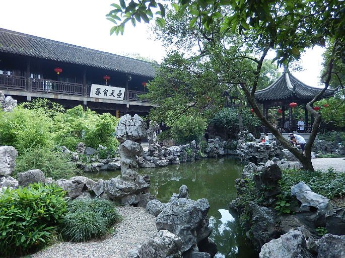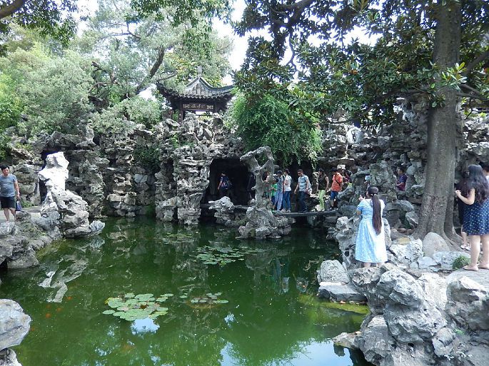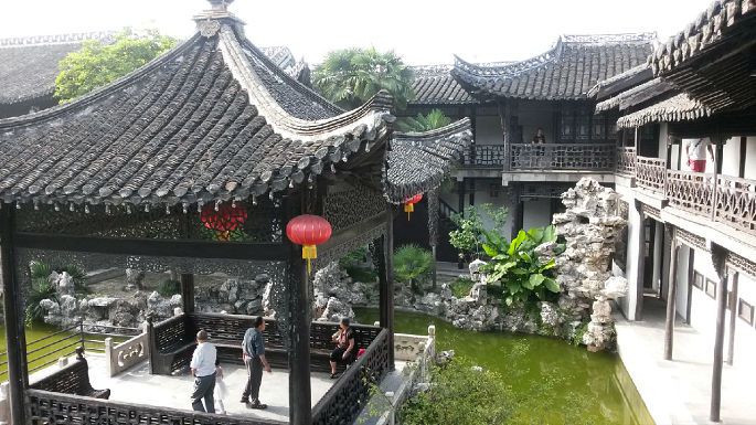 问了当地人前往个园而去。个园由两淮盐业商总黄至筠建于清嘉庆23年(公元1818年)。1988年个园被国务院授予第三批“全国重点文物保护单位”。我是南门进园,门头不大,但进去后发现,里面是万千竞秀。不再是穿堂几进,而是园园相通,院院相接。个园是以竹石取胜,连园名中的“个”字,也是取了竹字的半边,应合了庭园里各色竹子,主人的情趣和心智都在里面了。垒石取名春夏秋冬四景。园中门外两边修竹劲挺,竹丛中,插植着石绿班驳的石笋,以“寸石生情”之态,状出“雨后春笋”之意。夏景位于园之西北,东与抱山楼相接。夏景叠石以青灰色太湖石为主,叠石似云翻雾卷之态,造园者利用太湖石的凹凸不平和瘦、透、漏、皱的特性,叠石多而不乱。山上古柏,山下有池塘,北阴处有一涓细流直落池塘,池中游鱼嬉戏穿梭于睡莲之间。池塘右侧有一曲桥直达夏山的洞穴,洞之幽深,颇具寒意,即使炎热的夏天,人们步入洞中,顿觉清爽。