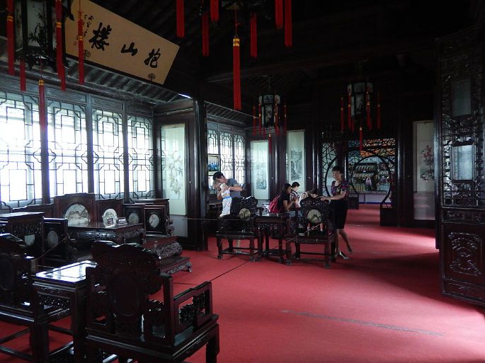 经过抱山楼的“一”字长廊,园之东部便是气势雄伟的秋景,相传出自清代大画家石涛之手笔。秋景用黄山石堆叠而成,山势较高,面积也较大。整个山体分中、西、南三座,有“江南园林之最”的美誉。整座山体峻峭凌云,显得壮丽雄伟。沿腹道攀援而上,至山顶拂云亭,满园佳境尽收眼底。秋山宜登,游走腾挪于尺幅之间,如历千山万壑,尽得攀登险趣。造园者将冬景安排在南墙之下,背靠高墙几乎终年不见阳光,远远望去似积雪未消,地面用白石铺成。冬山用宣石(石英石)堆叠,石质晶莹雪白,每块石头几乎看不到棱角,给人浑然而有起伏之感。冬山宜居,最好是仨俩知己,聚在这座面山而筑的透风漏月厅里,围炉赏雪、夜话。