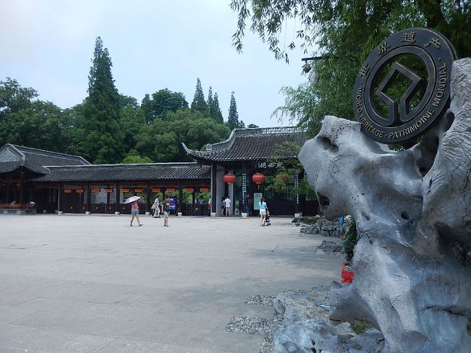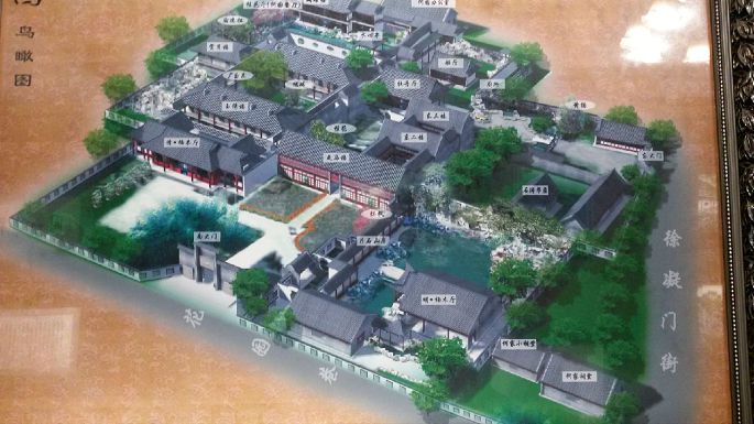 何园坐落于徐凝门街。又名“寄啸山庄”,清同治年间,道台何藏舠在双槐园的旧址上改建成寄啸山庄,占地14000余平方米。园名取自陶渊明“归去来兮……登东皋以舒啸,临清流而赋诗”之意,辟为何宅的后花园,故而又称“何园”。光绪九年(公元1883年),园主归隐扬州后,购得吴氏片石山房旧址,扩入园林。全园可分为东西两个部分,以两层串楼和复廊与前面的住宅连成一体。东园的主要建筑是四面厅,为一船厅,单檐歇山式,带回廊,面阔15.65米,进深9.50米。以此建筑为主景,南向的明间廊柱上,悬有木刻联句“月作主人梅作客,花为四壁船为家”;厅北有假山贴墙而筑,参差蜿蜒,妙趣横生;东有一六角小亭,背倚粉墙;西有石阶婉转通往楼廊;南边建有五间厅堂,三面有廊。复道廊中的半月台,是中秋赏月的好地方。西园空间开阔,中央有一个大水池,楼厅廊房环池而建。池的北楼宽七楹,屋顶高低错落;中楼的三间稍突,两侧的两间稍敛,屋角微翘,形若蝴蝶,故而俗称“蝴蝶厅”。楼旁与复道廊相连,并与假山贯串分隔,廊壁间有漏窗可互见两面的景色。池东有石桥,与水心亭贯通,亭南曲桥抚波,与平台相连,是纳凉之所。池西一组假山逶迤向南,峰峦叠嶂,后有挂花厅三楹,有黄石假山夹道,古木掩映,野趣横生。池西的复廊南有一幢三开间的两层小楼,独占小院的一角,楼前山石峻峨,清静幽雅。由此再往南即为住宅区。