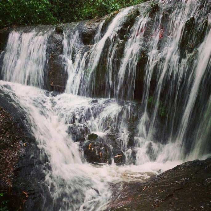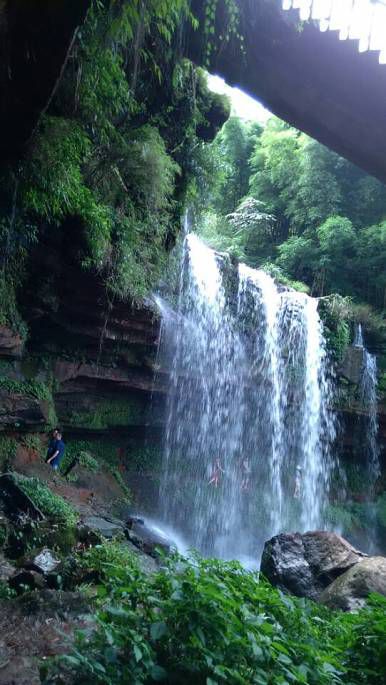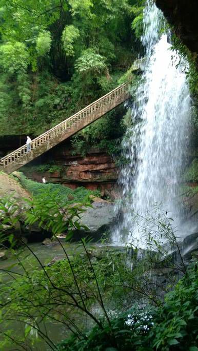第六站:七彩飞瀑。位于石鼓山和石锣山的葫芦谷中,还要坐船摆渡,这个地方分四级倾泻而下,如果晴天正午,彩虹生于潭底,可惜当天没多云浓雾为主,那么就感觉瀑布很普通了,只是翠竹掩映,危崖高悬,景色上也算不错,无论是和瀑布合影还是戏水,或者从瀑布之下穿行,都是很惬意的事情。如果说它特别惊艳,那么也没有,反正很开心就对了。走了一圈,里边还有一个八卦图的建筑,是《风云2》的拍摄地。差不多12点了,我们返回到农家乐点了几个家常菜,吃了午饭片刻休息,继续出发。