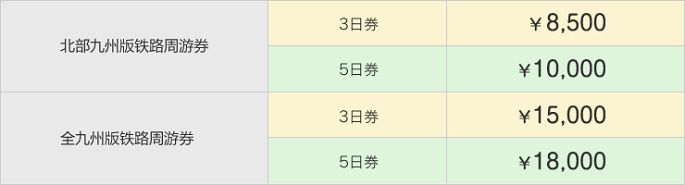 周游券分3日券和5日券,地区也可以选择北九州和全九州,建议出发之前算好需要乘坐的JR列车,根据乘坐的天数购买适当的周游券,这样最划算。