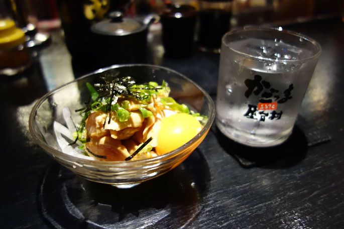 在菜单上看到一个奇怪的菜名,和店员指手画脚的比划了半天也还是不明白到底是什么菜,最后还是出于好奇点了一道。上菜以后才明白,原来是生拌鸡肉!既然点了不能不吃,皱着眉头尝了一口,并没有奇怪的味道,反而意外的有几分甜意。生鸡肉非常软滑,再拌上新鲜的生鸡蛋,非常好吃,坐在我旁边的客人看到我点了这道菜也不禁提起了兴趣,跟着点了两份。听老板介绍说鹿儿岛的烧酒很有名,一个没忍住也点了一杯屋台村烧酒,生平第一次喝烧酒,还是一个人在异国他乡,这也能成为一段美好的回忆吧。