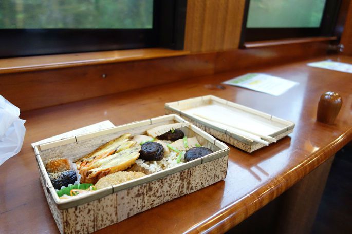 正当我沉迷于车窗外的美景时,可爱的列车员推着小车来卖点心和饮料,这么一说还真有点饿了,兴冲冲的跑去后面的车厢买便当。今天正巧是周六,平时只有预定才能吃上的嘉例川便当可以直接在车上购买。我去的有点晚,买便当的人已经排起了小长队,到我的时候还剩下两盒,真是太热了!所幸还是让我尝到了~