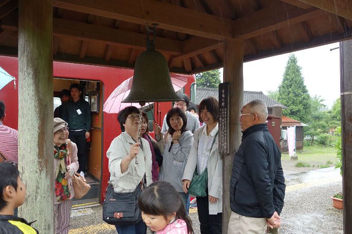 沿途经过真幸车站,有一座幸福之钟。据说如果你觉得现在很幸福,就敲一下钟,让幸福延续,如果你希望更幸福的话,摇两下钟,让幸福加分,如果你觉得现在有些不幸,就摇三下钟,让幸福快快到来。车上的乘客,无论男女老少,都排起长队有秩序的敲钟,每个敲完钟的人脸上都洋溢着幸福的笑容,仿佛这幸福之钟真的显灵了。