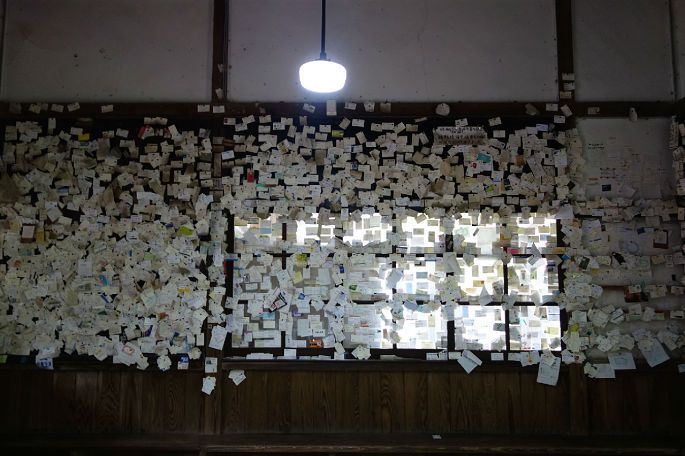 第三站大畑站,站内站外的窗户上,墙壁上,门柱上都满满的贴上了来自世界各地游客的名片,据工作人员说只要把名片贴在这里,就能飞黄腾达。