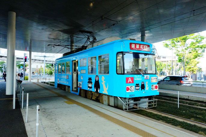 放好行李才出来溜达。JR熊本站正对面,就是熊本的路面电车车站,车上印着当地的吉祥物熊笨熊,黑黑的身子,红红的脸颊,看的人忍俊不禁。