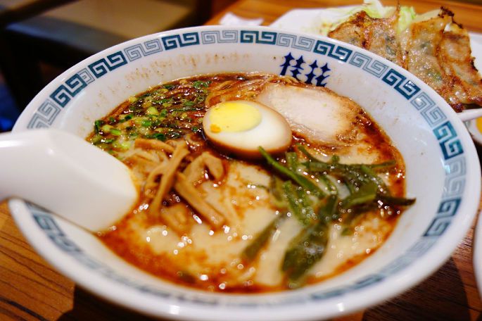 听说熊本的拉面很好吃,便搭着电车不远千里(其实真的不远哈哈)冲去朋友推荐的桂花拉面店。店铺外的橱窗里摆着各种餐点的模型,可以看着模型挑选自己想吃的食物。