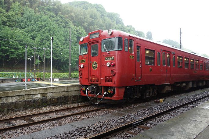 吃完便当,列车也停靠在终点站——吉松站,日本设计换乘就是这么合理,下了车连站台都不用换,没等多久就换乘上伊三郎·新平号。火红艳丽的外观和隼人之风的炫酷黑色形成鲜明的对比。