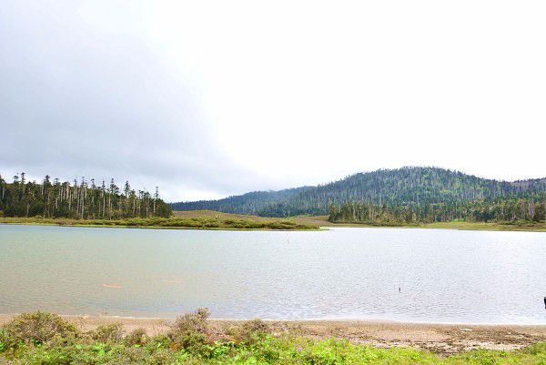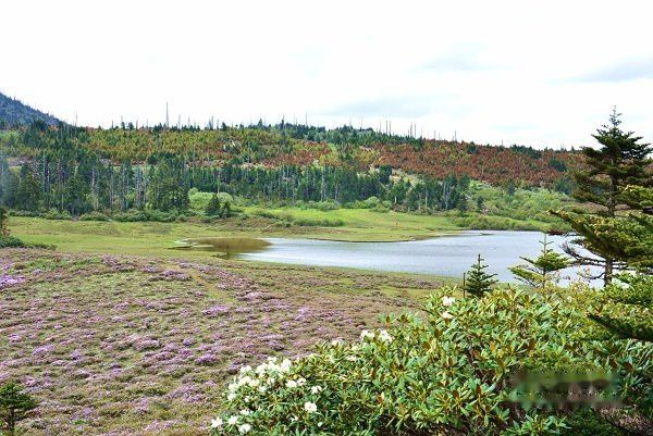 天池中央有一个椭圆形的小岛,小岛上杜鹃成林,野鸭在湖中和湖周围的水草中,若有若无,没有把叫声和飞扑的身影传开,静静地遵循着天池的自身规律。