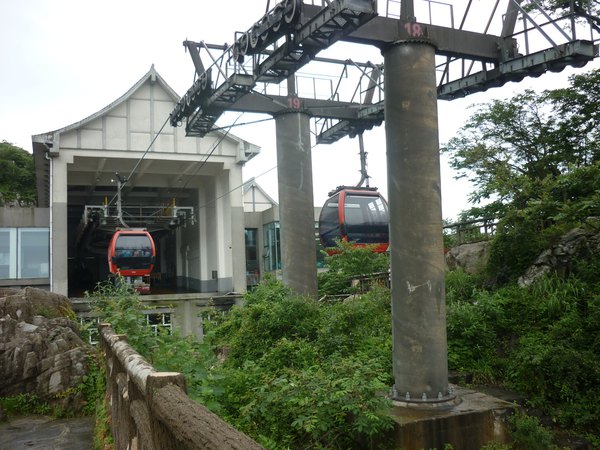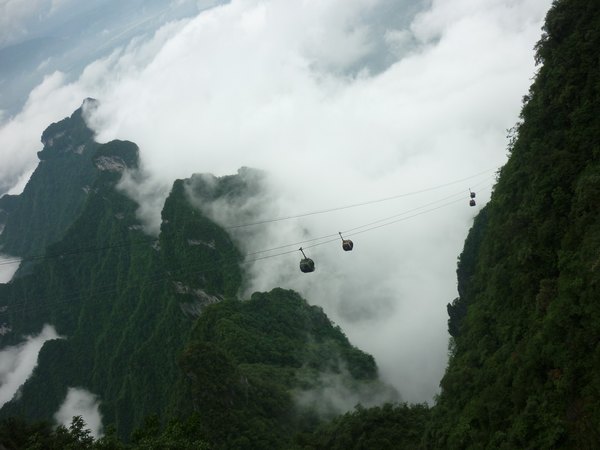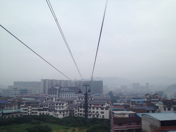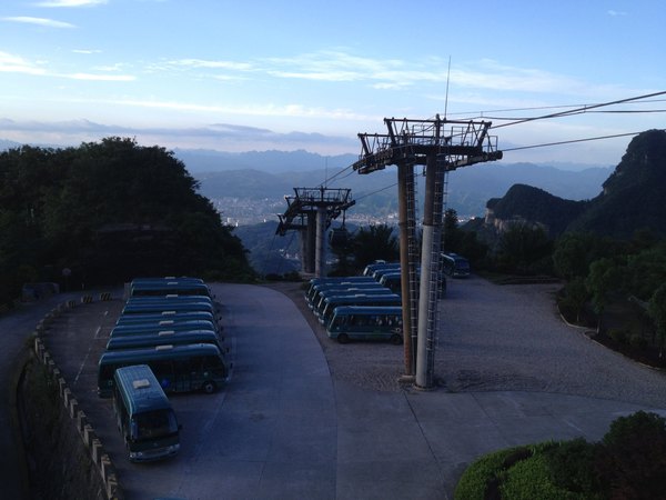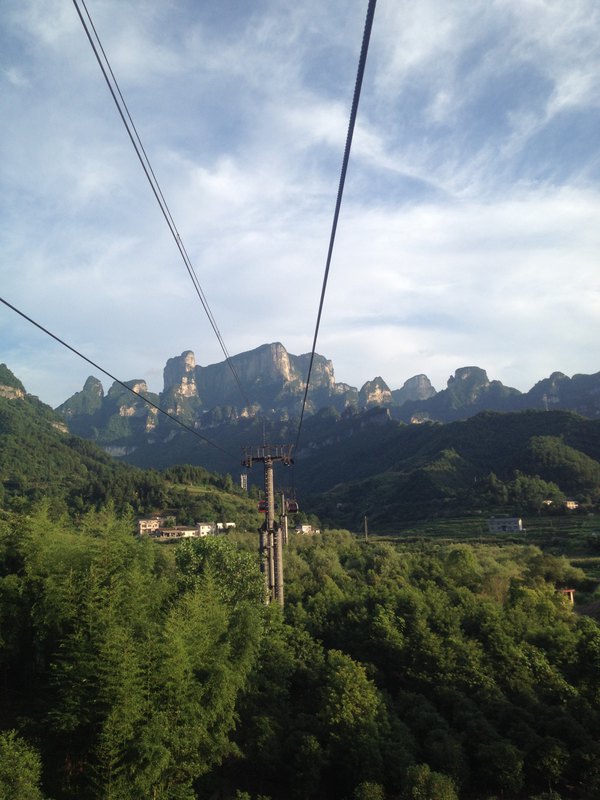 山顶森林观光缆车从天门山主峰云梦仙顶至天门山寺前樱桃湾广场,总长度800米,单程运行时间约10分钟,票价RMB25单程,为无遮盖的双人吊椅式。我们没坐。