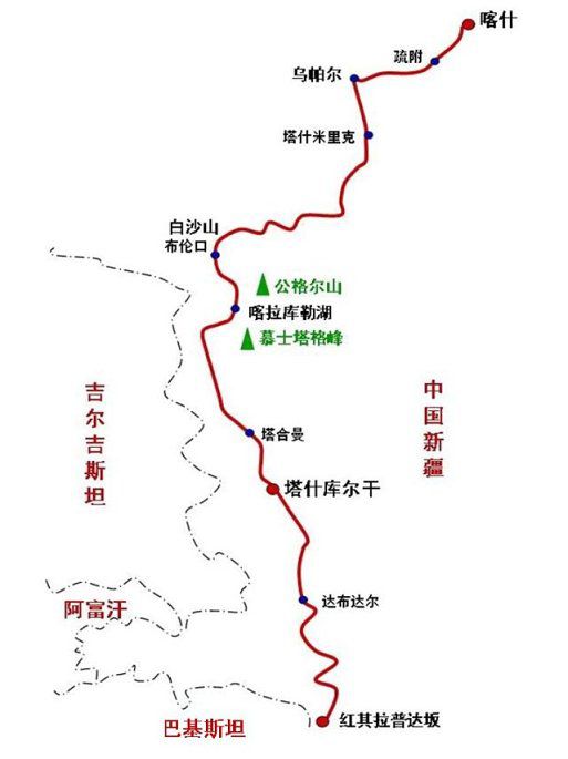 314国道(或“国道314线”、“G314线”)起点为新疆乌鲁木齐,终点为新疆红其拉甫,全程1948千米。此次我们的车从喀什(1480)-塔什库尔干(1802),再到红其拉甫(1880),其中喀什到塔什库尔干322公里,塔什库尔干到红其拉甫78公里。