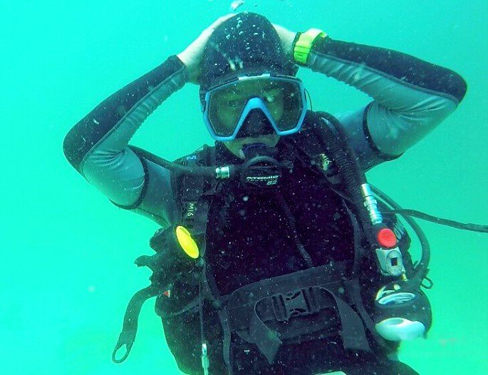 今天先是考验了一段游泳,还要水面漂浮10分钟,然后学习了装备的装卸,BCD的穿戴,潜伴安全检查,平静水域中学习中性浮力,以及各种水中可能遇到的问题,如二级头丢失寻回,面镜进水后排水,面镜摘除后带回等等,都是潜水中基本的一些东西。然后一堂公开水域的课程,就是跟着教练去看看海底。