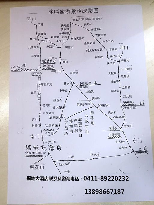 关于去冰峪沟的吃住,这里推荐一下每次去都住的地方,酒店处在仙人洞镇最中心位置,镇政府广场斜对面,每次出发前会给老板打电话预留房间,推荐的理由是首先这家酒店的老板人简直太好了,第一次跌跌撞撞去的时候,老板直接把冰峪沟里沟外的行程都安排好了,还专门给做了一张据说只有福地酒店有的冰峪沟全方位360度无死角线路图(稍后奉上线路图照片...)!,包括路线,停车,坐船,怎样用最短的行程能不错过任何一个景点走完冰峪沟,沟内哪些钱可不花,等等等等。而且更重要的是,酒店的客房档次不低干净的不得了不说,价格是真心的便宜,别赶上旺季或者黄金周,我们去的时候才不到100块钱...稍后会上照片,大家自己感受一下吧,真心推荐去冰峪沟玩的朋友,如果能订到他家酒店的话,可以体验一下看看,良心商家啊...不说了,上图吧!
