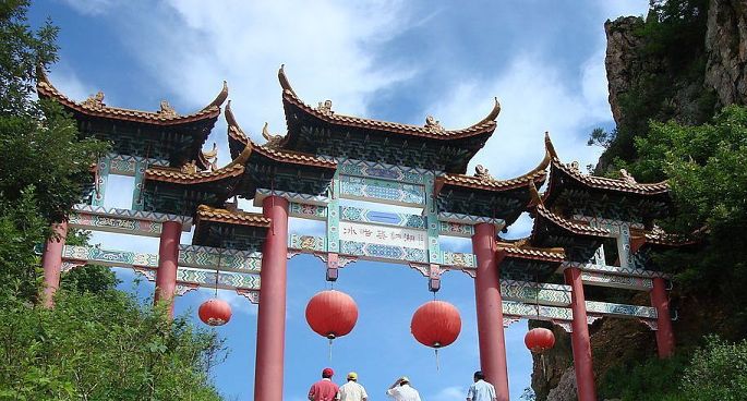 酒足饭饱加上小憩一会之后,我们大约在下午一点出发进冰峪沟,从酒店出发1500米不到,一脚油直达冰峪沟南门买票,南门装饰还蛮奇怪的...