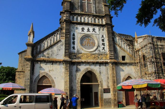 | 出五彩滩,沿着香蕉林边的小路向北,经东安村、石盘河、上下坑仔、上下牛栏山,约半小时即可到达盛塘村。香蕉是岛上人家除捕鱼外的重要经济来源,路边结满累累果实的香蕉树比比皆是。但由于数量巨大,估计当地人也懒得特意照看,行人经过,掰一两串来吃,料也无妨。 盛塘村原名圣堂村,因村内有十八世纪中期法国传教士修建的哥特式教堂而闻名。教堂由修道院、育婴堂、学堂和钟楼组成,建筑取材于岛上的珊瑚礁、石灰岩和火山岩,建筑精美,风格独特,历经150余年风霜而不改威严。斑驳的墙面,述说着沧桑的往事。教堂内安静庄严,阳光从圆拱形的窗户中射进来,透过窗棱洒在长椅上,教堂内光影迷离,更显庄严肃穆。沿着石制的螺旋楼梯上到顶楼,顶层是一座铸造于1889年的银合金大钟,每当钟声响起,整个涠洲岛的人都可以听到。岛上有近一半的人信奉天主教,每晚7点,钟楼的钟声响起,教徒们会来到教堂做祷告。 | ||||||||