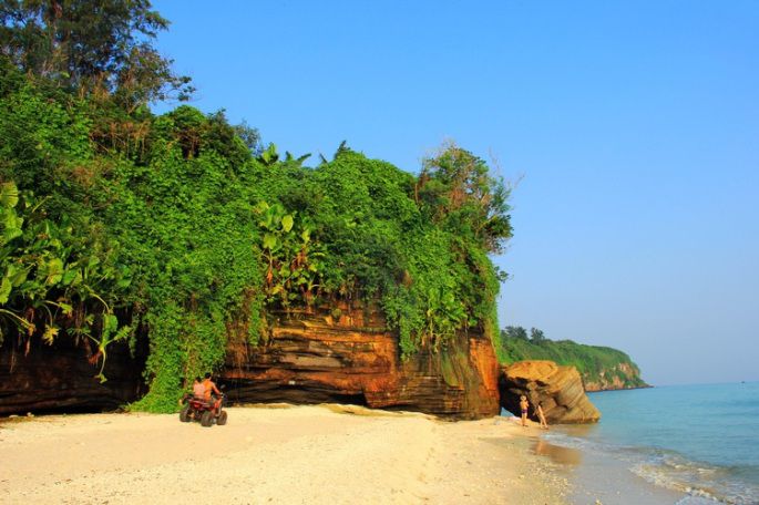 | 踱出北部湾广场,乘坐6路公交车直达冠头岭国家森林公园。冠头岭国家森林公园位于北海市西南角,因其山岭蜿蜒起伏,似一条青龙蜿蜒于海面上,整个山岭“穹窿如冠”而得名。由主峰望楼岭、风门岭、丫鬟岭、天马岭等山峦群体组成。沿着公路慢步上行,透过郁郁葱葱的森林,整个北部湾尽收眼底,海天一色,渔船如繁星般点缀其间,天空中海鸥飞翔,海风吹拂,令人心旷神怡。 冠头岭下既是南万海滩,海滩上礁石林立,惊涛拍岸,潮声如雷,其“龙岩潮音”为北海一大著名景观。海岸沙滩绵软洁白,波涛似雪,因而称为北海婚纱摄影的首选之地。天气晴好的时候,海滩上会有诸多新人在此拍照。坐在岸边礁石上,听惊涛拍岸,看浪花如雪,美不胜收。 | ||||||||