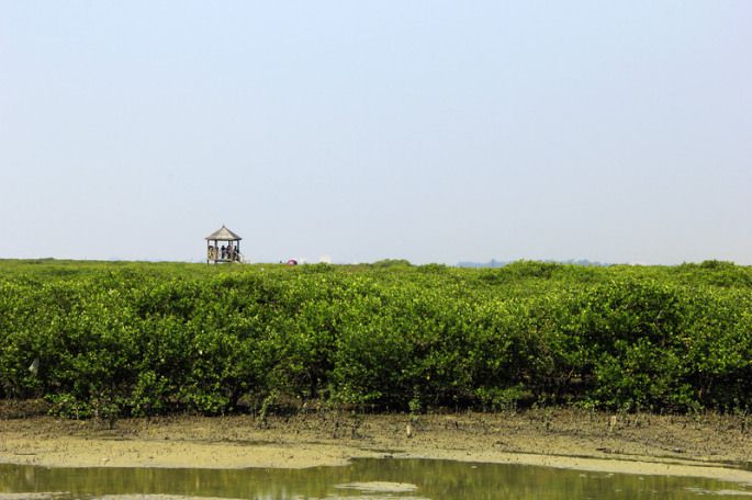 | 出了海底世界,打车前往金海湾红树林生态旅游区。 金海湾红树林位于北海市区东南方约15公里处,与素有“天下第一滩”之称的银滩一脉相连。 景区面积约20平方公里,由红树林观光带、金滩和主园区三部份构成。区内拥有一片2000多亩的海上“森林卫士”――红树林,上百种鸟类、昆虫、贝类、鱼、虾、蟹等生物在此繁衍栖息,是我国罕见的海洋生物多样性保护区。中国的红树种类有37种,金海湾红树林景区内就有7种:白骨壤、桐花树、秋茄、海桑、卤蕨、木榄和红海榄。 沿着景区内步道前行,密密匝匝的红树林犹如一片碧绿的被子,覆盖在滩涂上。涨潮时,树林的根部完全浸泡在海水里,只露出郁郁葱葱的树冠;退潮时,整片的红树林裸露于滩涂上,颇为壮观。树下的滩涂中生活者寄居蟹、牡蛎等生物,最奇特的是一种叫弹涂鱼的两栖生物。每当到了繁殖季节,雄鱼会用胸鳍撑起身体,张大嘴巴,并竖起漂亮的背鳍,在滩涂上蹦跳,很是好玩。 | ||||||||