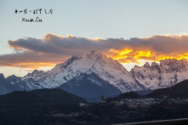 转过一个山头突然几座雪山一览无余的展现在眼前加上火烧云,非常美丽,领队大喊,快看梅里,于是兴奋的一车人马上靠边停车,虽然是侧峰,但是心中的满足感顿时有了升华,继续期待。果果很开心“看吧,我人品好吧”