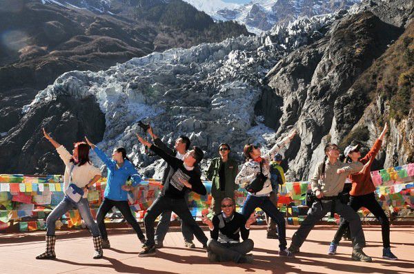 第二天的主要内容是看雪山和爬明永冰川,担心体力问题,最终还是把果果劝上了马背,领队为了照顾团队的其他成员到队尾押队,我就只能帮果果牵马了,十多公里连续长坡还高原,我还得跟上马的速度,结果一个小时登顶,果果也难得的高度评价了我的户外能力和体能,观景平台等了一个半小时同行的boss一行和猴哥夫妇也抵达了平台,一阵臭美后大家下山,把果果送上马背后,当地人牵着,为了防止跟在马后面吸入太多灰尘我依然冲在了第一个下山,结果果果说下山骑马太吓人,我又跑的太快,他只能一个人下山,于是我又被一阵臭骂,尴尬