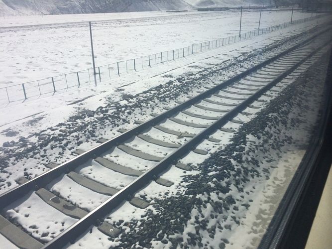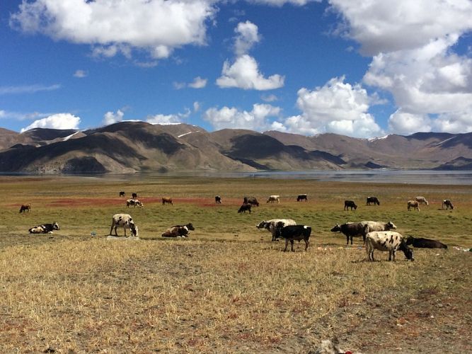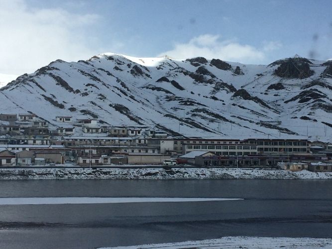 而窗外,美景正逐渐铺开。一个转弯,漫山白雪幻化成一望无际的戈壁,几抹绿意挣扎出来。再前进,湿地与碧水波澜不惊,成群的牛羊黑白成趣,远远看去,似乎是静止的。水对岸的雪山脚下,居住着人家。不禁让人心生感慨,世事跌宕,然江山亘古,生命不息。