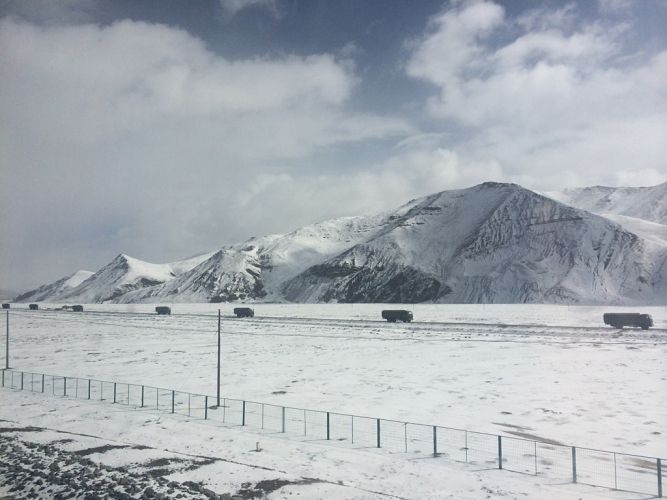 一列军车,缓缓经过念唐古拉山脉,手机随手拍,居然拍出了电影胶片的古朴感。天路,果不其然的美丽