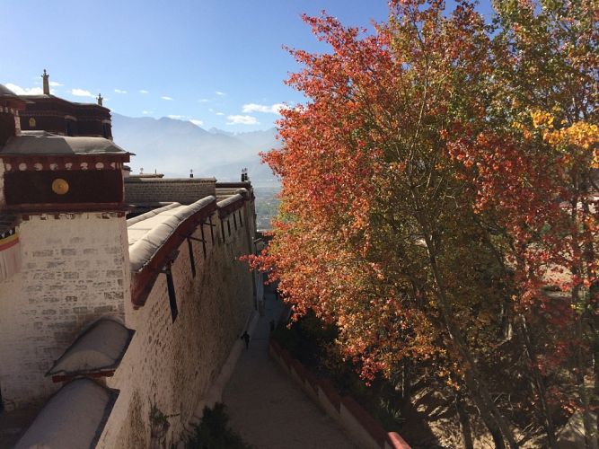 在红山上的布达拉宫是建筑史上的经典,傲然蓝天白云之下,外在红白相间,寓意政教合一。内里奢华优雅,满满的都是藏族的历史文化。无数的唐卡、黄金、珠宝堆积在灵塔中。据说十三世达赖的灵塔就可以购买半个上海,让人咋舌。藏人们围绕着布宫一遍又一遍的转经转寺,祈祷着幸福安康。从深秋金黄色的布宫广场和药王山上静观布宫,有着不同的角度和感悟。