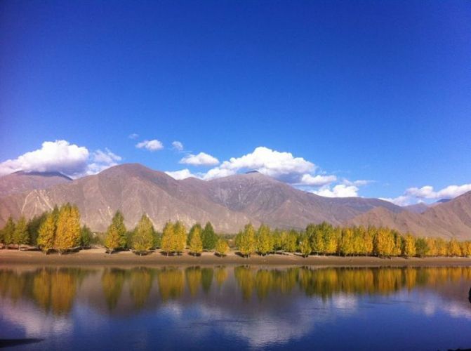 去日喀则的路上,处处都是风景,蓝天白云是基本配备,懒散的牛群在黄叶飘落的林中吃草,发出满意的哞哞声。