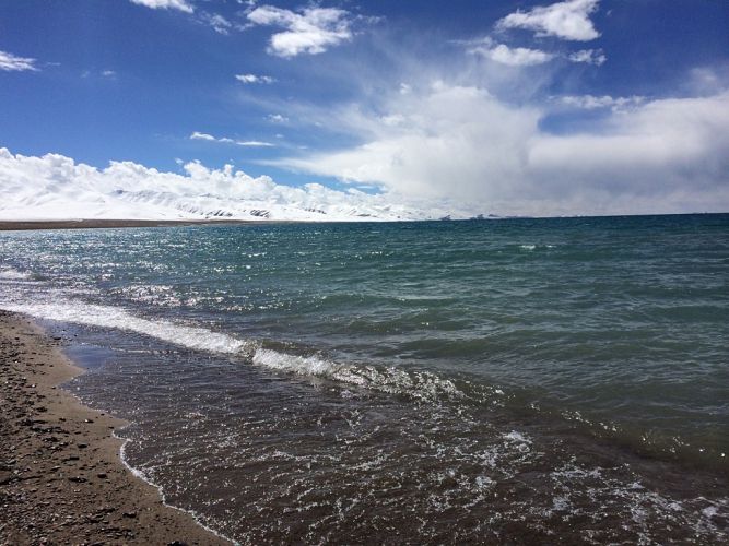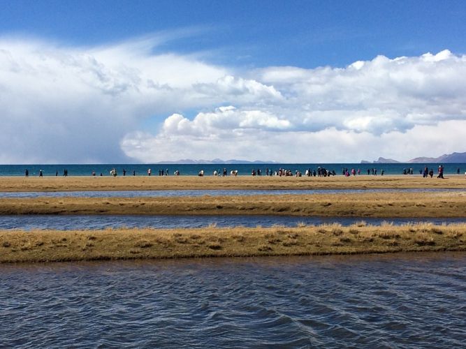 如果说羊湖之美如绿松石,那纳木错就是最美的蓝宝石。雄壮的雪山给柔美的纳木错增添了特有的风采,远处水天交于一线。