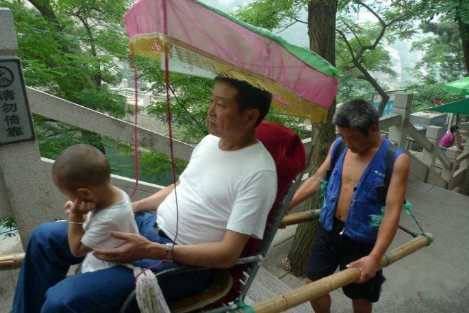 爬山实在是一个体力活,在出透汗水的同时,休息片刻,我们不得不惊叹抬滑竿的人们,那才叫体力惊人。一个个滑竿从身边超过,有的上面除了坐个大人还有孩子。