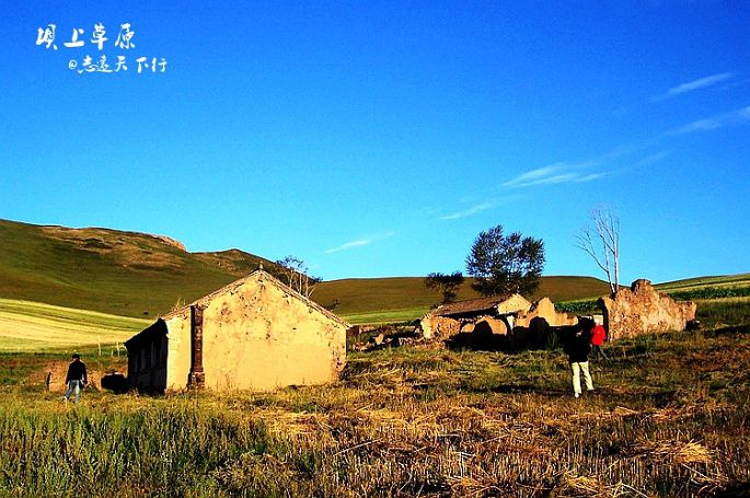 不远的山坡上,散落着一个败落的村落,绿地里零星的布局着一些残垣断壁。一直在幻想着风吹草动现牛羊的景象,一直想不出牛羊隐没在草丛中的身影该是如何。当我自己在高高的作物中穿梭的时候,我刹那间明白了那样一种美好的意境和感觉。