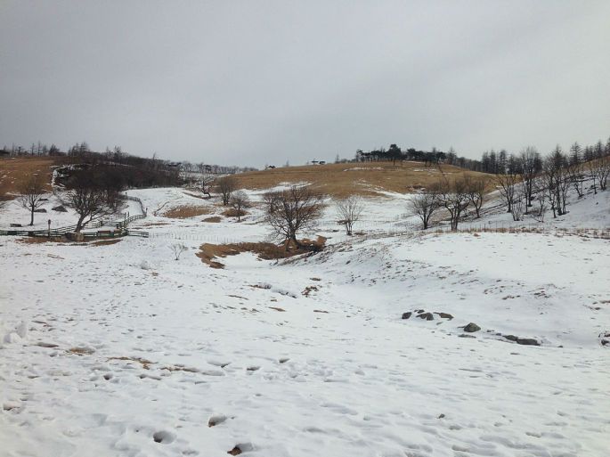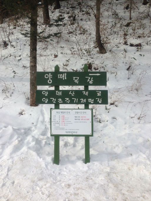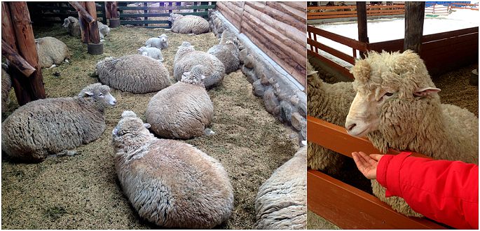 进入羊群牧场,那漫山遍野的雪啊~~真的真的超级漂亮,特别特别厚特别特别白!!!表示伦家我怎么也是北方人,自认为是看过大雪的人,但是真是和江原道的雪没法比~~~好开森~~~恶哈哈~~我们先来到了看小羊的地方。话说。。。小羊。。。其实。。。真的。。。很!大!只!!肥的要命,感觉毛好厚好厚,果然羊毛衣最暖和了,相信它们也这么想~~~