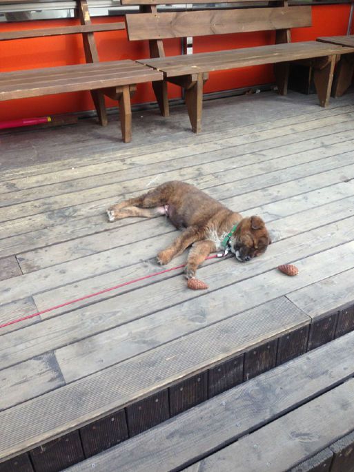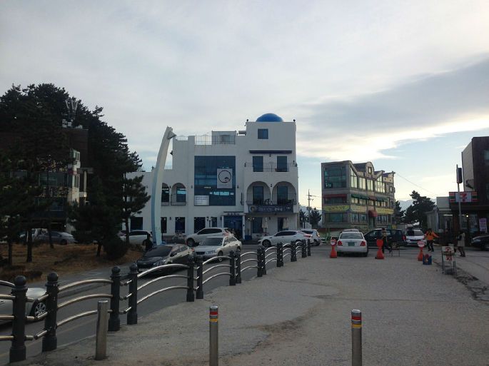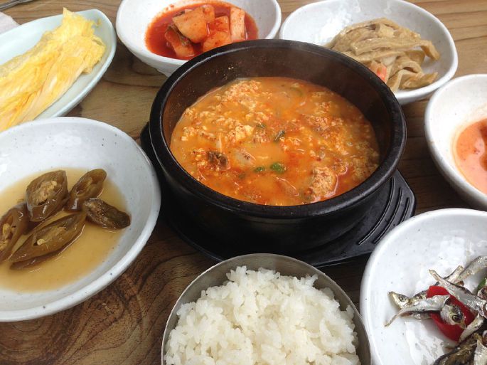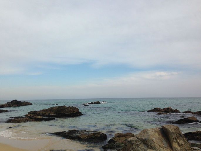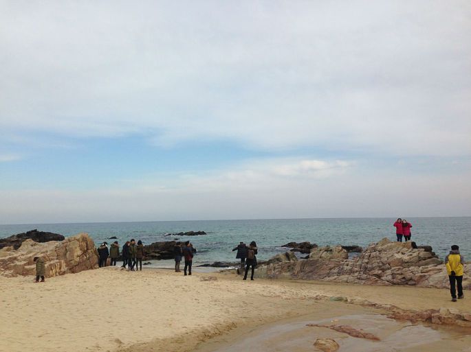 从羊群牧场出来,我们就奔向正东津。 正东津我之前就一直想去,听说日出特别美的一个地方,可惜那么早人家又不知道路至今没实现过。虽然还是没有看日出反正能来就开森~~嘚瑟一下~~~到正东津都已经12点30多了,于是饿的鬼一样的我们决定先去觅食。本来想吃大螃蟹的,不过导游说这个季节生鱼片啊、螃蟹啊什么的都不是最新鲜的时候,建议我们吃当地很有名的嫩豆腐汤,其实我当时还是小犹豫了一下的,不过听说江陵做嫩豆腐技能和其他地方都不一样,只能在江陵才能吃到的,所以果断点了,味道嘛。。。其实就是嫩豆腐汤,不过确实和首尔不是一个味道。还有个搞笑的事情就是那家店还养了只小狗,虽然它一只处于高冷路线,但是名字却叫豆腐。。。这只明显面瘫的高冷狗要是听得懂人话难道真的不会满脸黑线么。。。