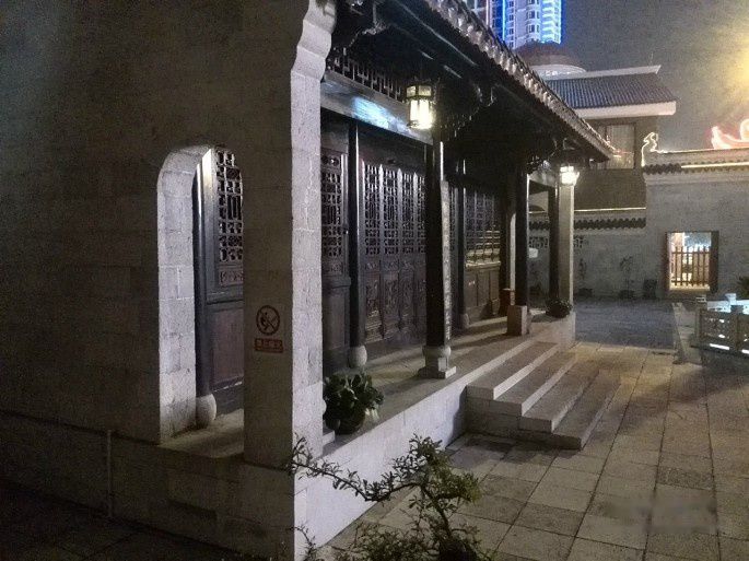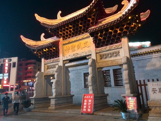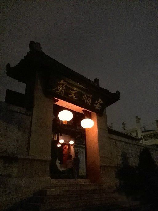在一个小巷馆子要了一碗鹅汤米线,味道还不错。顺路向北走,走进了儒林路,看介绍离文庙近。儒林路是条老街,房屋残旧,好象有一些是明清时代的民房,以街为市,倒还热闹,地为石板路,夜里在灯光下发亮。商铺大都是杂铺或馆子,虽然有些乱烂,但有些商铺倒也干净整洁,但总体还并不美观,只是儒林路的历史味道,还时不时有老外来造访。穿了几个狭窄小巷,还终于见到安顺文庙。文庙建筑有些历史,是全国文物保护单位。夜里只有看到文庙的夜影,看不真切,但大概看得出石雕柱子有些古朴,文庙内院红灯暗彩。守门老头不准进,说是晚上内院是喝茶的,不能参观。大门停有许多车辆,比如四个圈的,也许这里是当地名流的社交场子。转到另一条街,又发现武庙。安顺城内有文武二庙,这在我走过的许多城市里还少见。武庙也是历史文物,有些地方还是重新恢复修建的。90年代还是什么单位的家属院,能恢复如旧,地方政府算是做了件好事。有此历史是要留下来让后人阅读的。武庙建筑布局与西北的古建有些相似,庙外是仿古石牌枋,庙墙高约8米,右开门,中间有两院两殿,两侧有相房。第一殿供奉着关帝,还有一年轻道士在为一年轻女子算卦。后殿未看清,也有服务员在为客人上茶。从两处我感叹,庙宇茶楼,真有点不靠谱,可也真与时俱进。