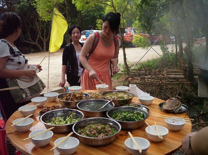 在美丽的山脚下准备户外野炊大餐。野炊(越来越多的游客喜欢户外运动,更加注重团体合作、亲自动手的乐趣。山庄特别准备了供游客自己动手,户外野饮的厨具及食材)
