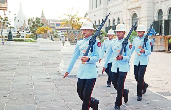 大皇宫紧邻湄南河,它是仿照故都大城的旧皇宫建造的,是历代王宫保存最完美、规模最大、最有民族特色的王宫。曼谷王朝从拉玛一世到拉玛八世,均居于大皇宫内。大皇宫的主要建筑是4座各具特色的宫殿,从东向西一字排开,一色的绿色瓷砖屋脊、紫红色琉璃瓦屋顶、凤头飞檐。屋顶是典型的泰国“三顶式结构”,集泰国数百年建筑艺术之大成。