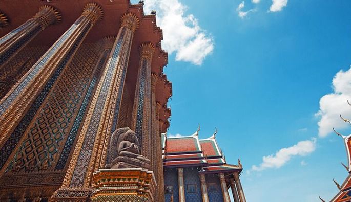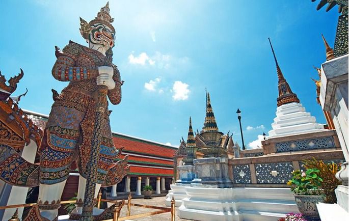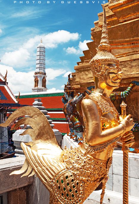 泰国玉佛寺位于曼谷大王宫的东北角,是泰国最 著名的佛寺,也是泰国三大国宝之一。是泰国王族供奉玉佛像和举行宗教仪式的场所,因寺内供奉着玉佛而得名。大皇宫和玉佛寺合称为曼谷的标志,是旅游泰国必 到之地。需要注意的是进入玉佛寺不能穿着暴露,穿短裤,无袖上衣,紧身裤都不能进入,但是却需要你脱掉鞋子,不过外面有卖纱巾的,价格也不贵,都会说中文100铸铸,哈哈,也就20块钱软妹币。