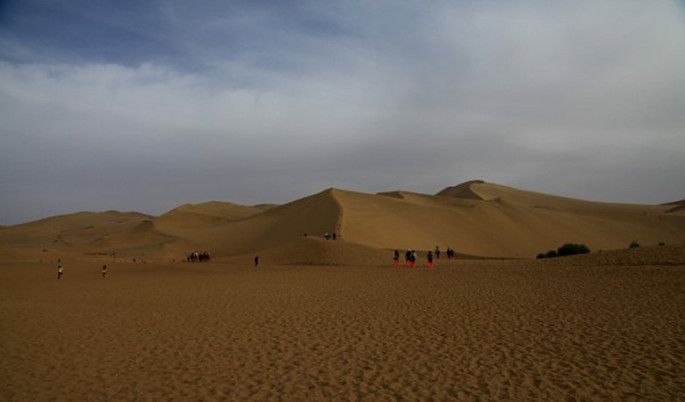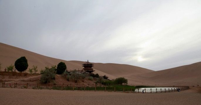 下午5点钟到达鸣沙山,天气没有早上好,厚厚的云层遮住了太阳,沙漠显得暗淡无色,估计拍摄落日的计划要落空了,心里有些失落。但现在少许的遗憾可能就是下次远行的动力。当我们骑着骆驼缓步在沙漠中,远处连绵起伏的沙丘、长长的驼队、悠扬的驼铃声、愉快的旅客、这一幕幕优美的画面时刻在感染着自己。月牙泉,据传说当年唐三藏西天取经,途径敦煌,因为无际的沙漠,没有水没有食物,唐僧艰难跋涉,此时正被观世音菩萨看在眼里,为祝他成功,所以从紫金瓶里滴下一滴金水,瞬间在茫茫沙漠中出现了一汪月牙似的泉水,后得名为“月牙泉”。由于天气原因拍摄效果也非常不好。晚上入住了敦煌最具特色的酒店——敦煌山庄(极力推荐,就是稍贵)。