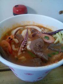 第四名:沙茶面,15-25不等。价钱不同是因为放的材料不同。我们吃的阿嬷的沙茶面是15元,里面有虾有卤蛋有八爪鱼有青菜有猪肝,味道棒棒的!不过沙茶面到处都有,每家放的材料都不尽相同,喜欢沙茶的可以都试一下,哈哈!