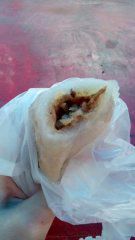 第六名:大肠包小肠,15/份。糯米肠里面包着腊肠(我觉得是)吧,还夹着花生和菜之类的。我觉得吃起来有点腻,但可以试一下。