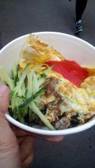 第一名:黄金御饭团,10元/份。做成小三角形的饭团,即叫即炸。炸完后淋上千岛酱和黄芥末再用脆脆的紫菜包起来,一口咬下去,忍不住由衷说一句:真好吃!