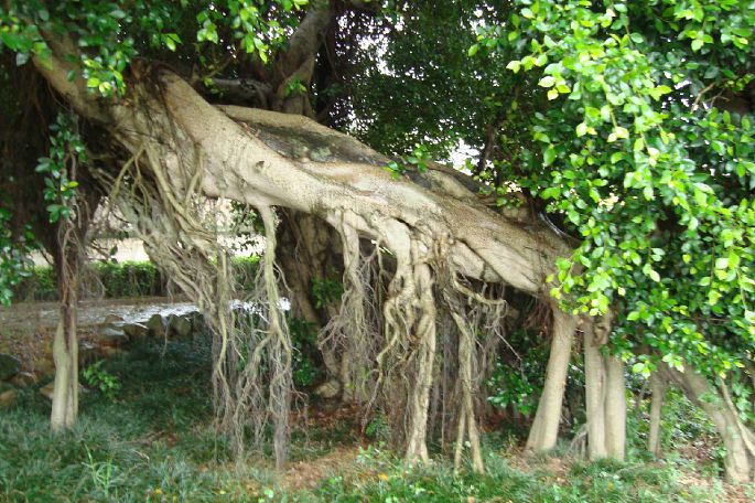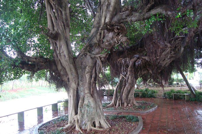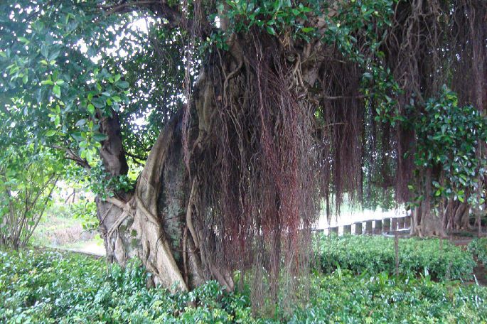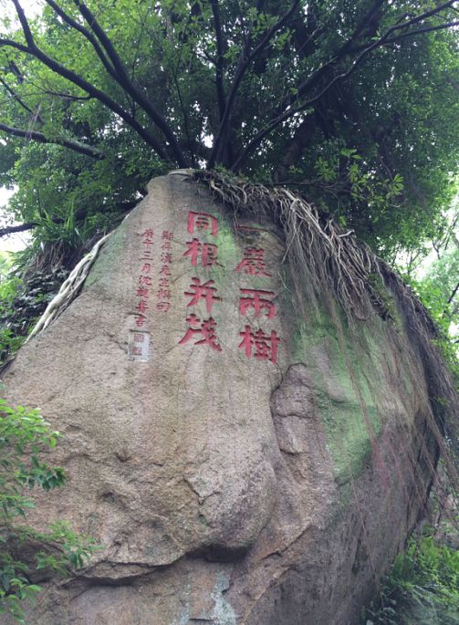 5、 猴屿洞天岩位于闽江口南岸最北端,距市区15公里,距闽江河口国家湿地公园4公里。猴屿岩洞因岩叠洞胜为闽江一绝。“鼓岩”之上,一条岩缝中竟然长着两棵品种不同的连根大树,一株榕树,另一株谁也叫不出什么树名,累累果实居然直接结在树干和树枝上。两树树皮一黑一白,疑是来自欧非两洲肤色不同的情侣,依偎在一起倾诉衷肠。著名书法家沈觐寿先生生前在岩上留下题刻“一岩两树,同根并茂”八个大字。