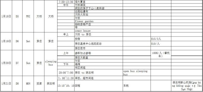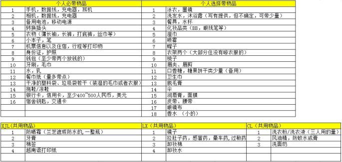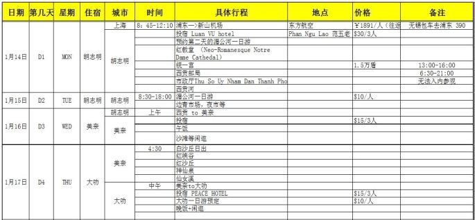 4. 分工: 我们此次是3人行,所以分别负责行程制定,物品list注意事项整理,地名越南语整理事项。