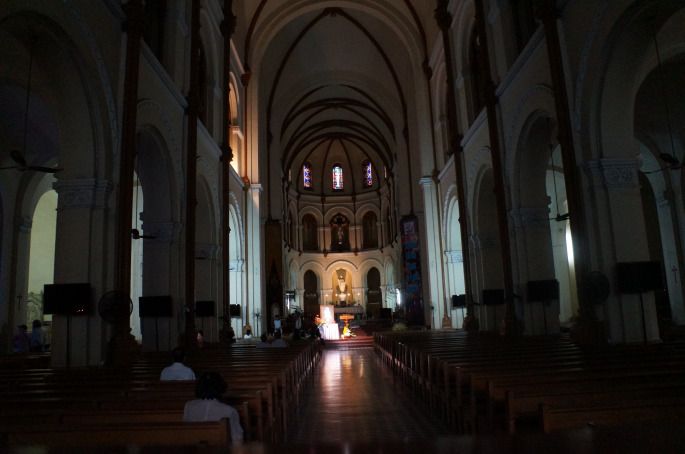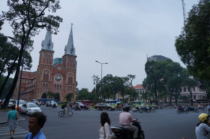 ►【红教堂】大名鼎鼎的西贡邮局对面是同样鼎鼎大名的红教堂Notre Dame Cathedral,全程胡志明市圣母大教堂,因使用红砖建造,又称红教堂,是胡志明市最著名的地标。教堂建成于1883年,为法国殖民时期留下的纪念品。两座40米高的钟楼塔尖直冲云霄,是仿照巴黎圣母院钟楼的设计。建造教堂的红砖全部从法国运来,至今没有丝毫褪色。教堂外部门廊等部位布满精美雕饰,内部四周均为小祈祷室,每一间的神龛、雕塑及装饰都不尽相同。