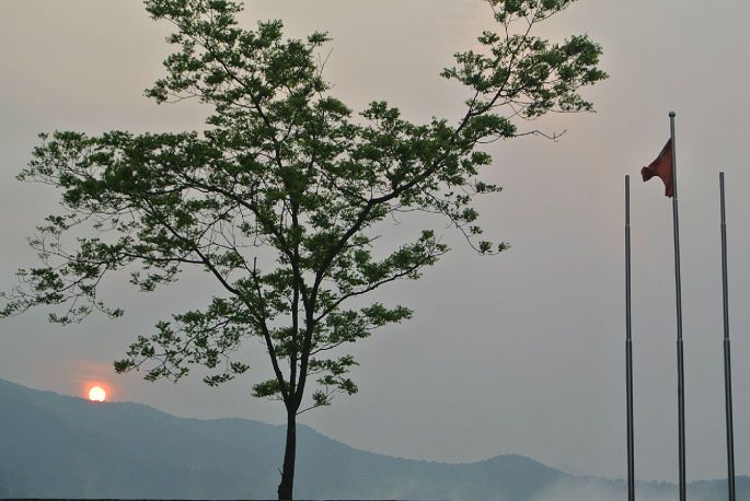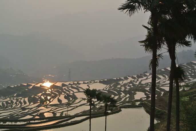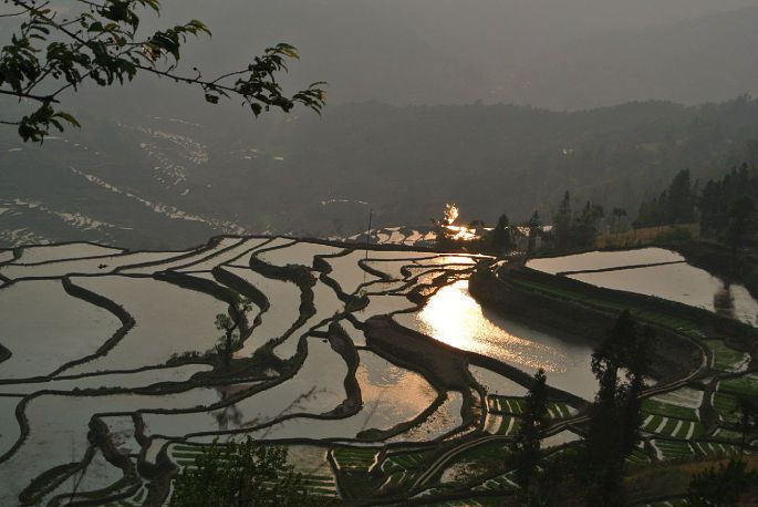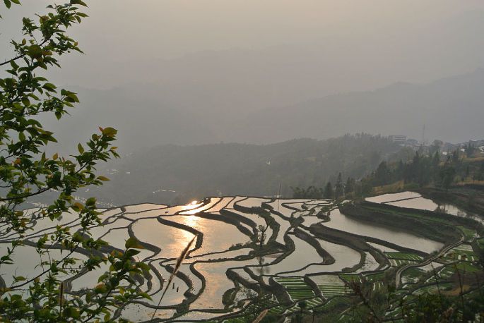 午饭后,山凹里雾还没散。只得回家。我们的房东是当地武装部住任,有辆七坐面包车,经我们要求,他答应带我们去甲寅12龙泉景区看梯田日落。我们兴奋的等待着。宝华到甲寅公路还没全部通,没有班车。一般要回到红河县城再坐班车过去。要大半天的时间,从宝华直接过去只要一个小时,近多了。一路盘山路,经过一个水库,一片梯田,到12龙泉,在那里拍日落,很漂亮。