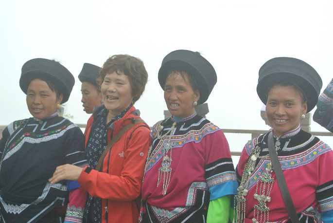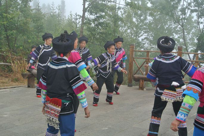 等安顿好天都黑了。宝华镇很小,没几家旅店。我们挑了“彝人之家”早早休息,准备第二天一早去撒玛坝景区看梯田的日出。 清晨,云很厚,雾很浓,我们吃了米线以后还是抱着狡幸的心理赶往撒玛坝景穿过在建的游客服务中心,进入景区,(现在是免票的)走了三公里到第一个观景台,大雾弥漫,能见度很低,观景台往下看,什么也看不见。但空气湿湿的,很清新。等到太阳升起来,大雾没有散去的可能,只好悻悻然的准备走了。这时远处传来午曲声,随着音乐声的临近看到一组盛装的哈尼族妇女唱着歌走上观景平台。她们歌舞的身影填满了我们的镜头,也宽慰了我们的心。