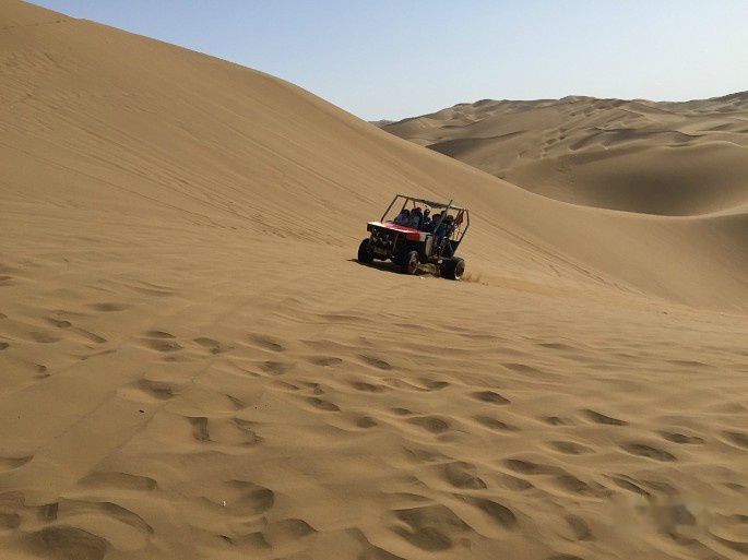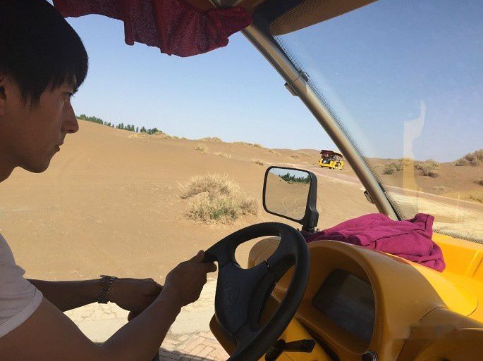 才入沙漠边缘,我们一伙就很快确定了要玩沙漠越野车。从沙漠边缘飞快的冲入沙漠高地,并且上下80度的各种飙车和冲刺,无拘无束,漫天黄沙,寸草不生,非常的惊险刺激。(沙漠越野车100元一人,虽然有点小贵,却是好玩到决不会后悔)