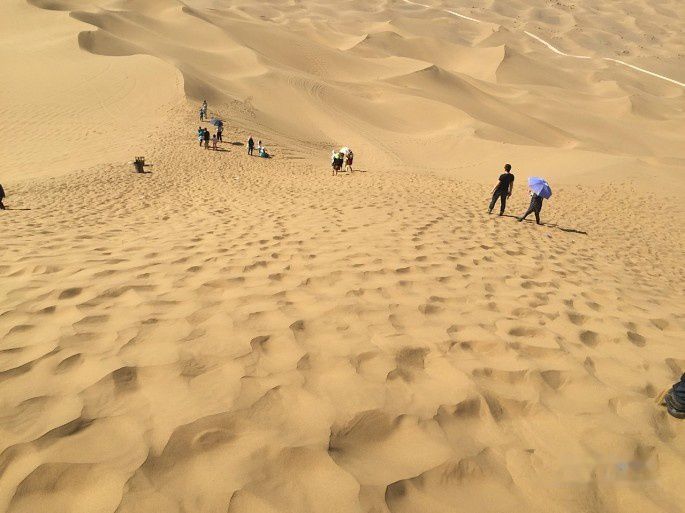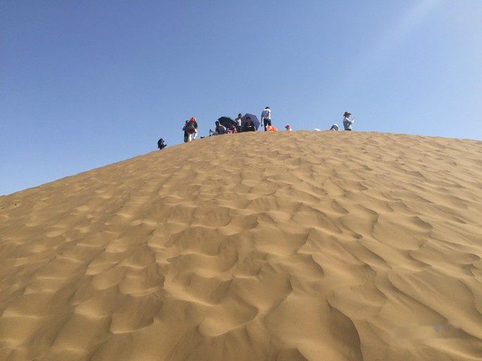 很快沙漠越野车就把我们送入了沙漠深处的一处高地。即使是短短几十米的沙漠地,从停车坪走到最高处,也是异常艰难。每一步都有大把砂砾把鞋子往下拉,而且很快沙土就侵入了鞋子和袜子里,抬脚难度如此之大,让我们深深体会到迷失沙漠是一种多么惶恐的事情。